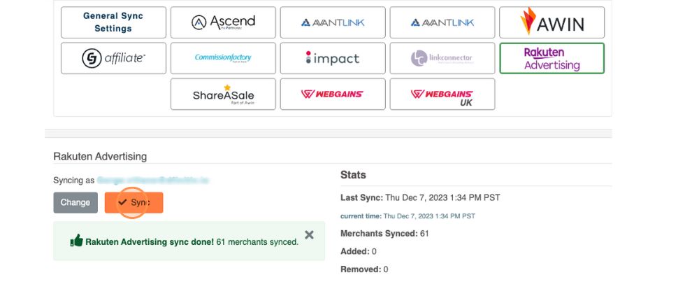 Click “Sync” - if setup correctly, a green confirmation box and the quantity of merchants synced is shown